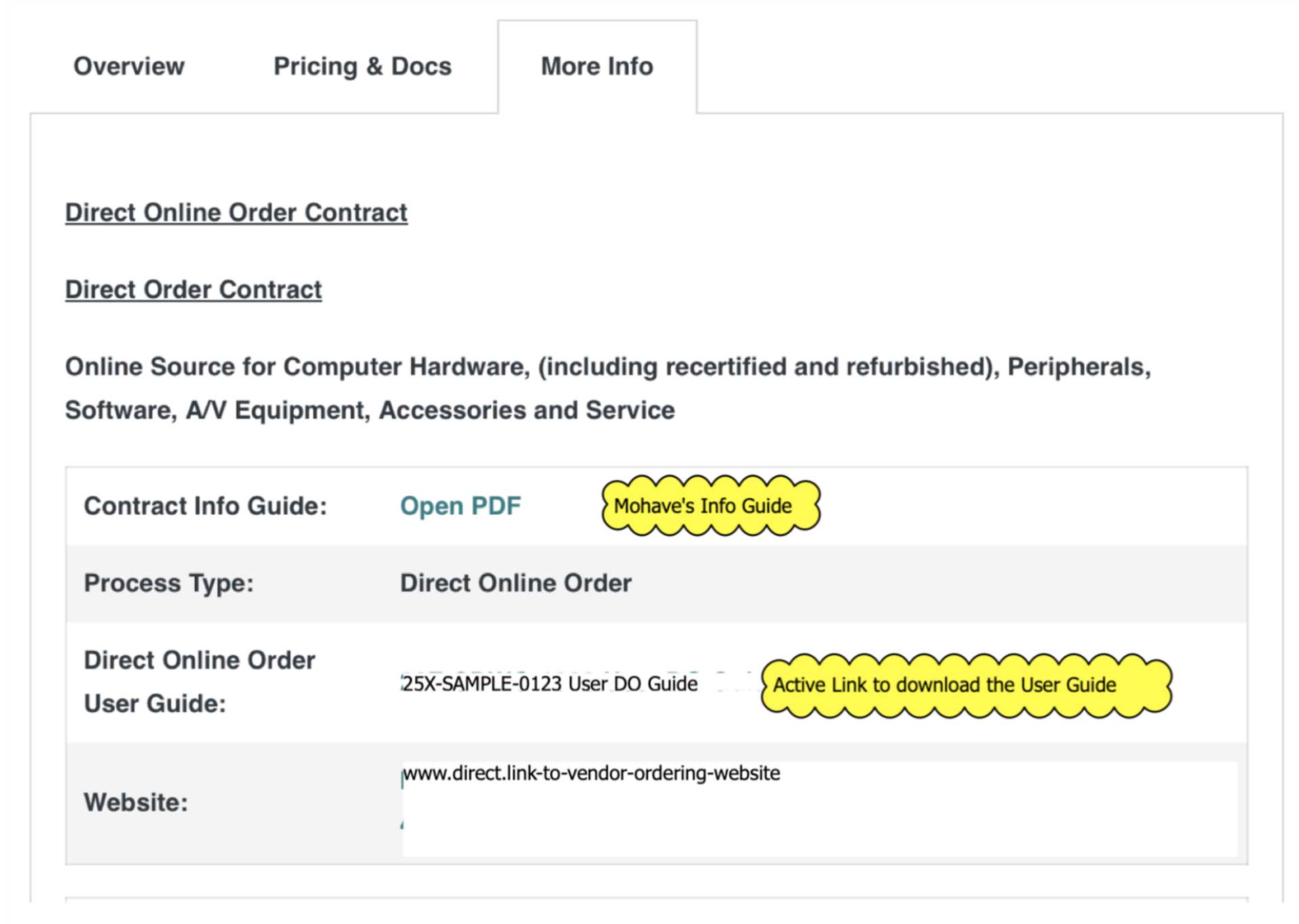 You can locate the contract vendor’s User Guide for each of our Direct Online Order Contracts under the More Info tab on the About Vendor page.